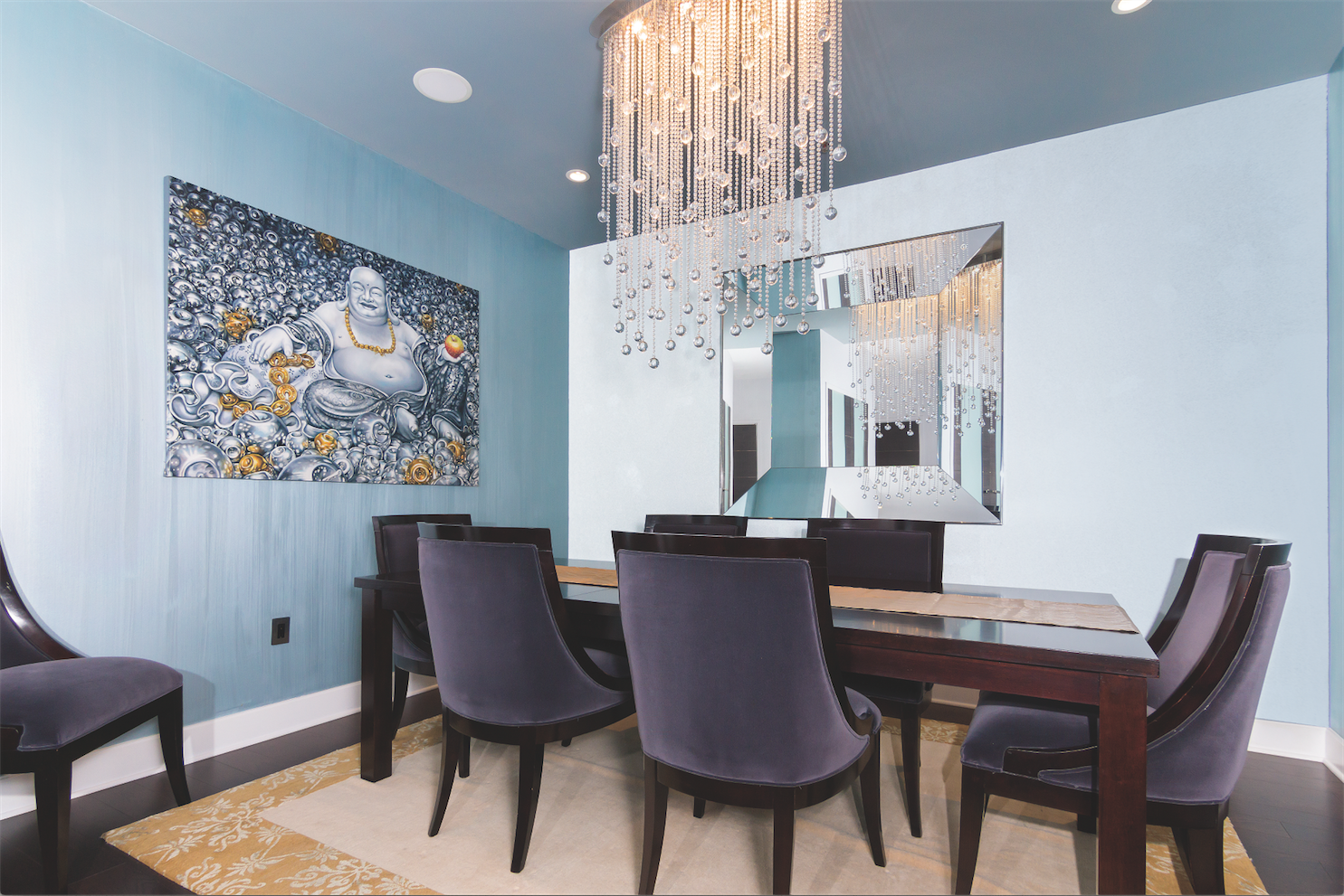 “It was very fun to merge Danielle’s modern taste with Jeff’s very modern taste,” Yvette laughed. “You enter the home and to the untrained eye you see a vastly simple modern space. When you break down all the details the level of attention that was paid is exquisite.” When Yvette began to list the number of custom items created for Danielle and Jeff’s dream apartment my eyes unavoidably widened. The headboards, interior doors, side chairs, sofa and rugs have all been custom designed to fit the exact space they find themselves in. The wallpaper was customized and meticulously planned for each room. For example, the dining room wall paper is all Murano glass bead imported from Italy. The fabrics all serve varying purposes and the combination exudes a level of class and luxury rarely seen in condo living. “The level of detail the space commands is amazing. For example, what looks like a simple shower curtain in the second bathroom was actually custom cut Larsen silk which needed to be specially ordered due to the high height of the shower rod,” explained Yvette who smiled as she calmly sipped her coffee. She clearly considers this a masterpiece and takes great pride in her work, as she should.