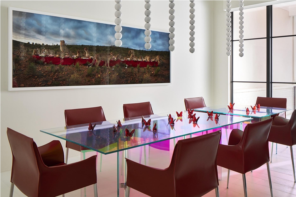 Wildlife is a recurring theme throughout the home. Ethereal butterflies (which additionally appear on a gold chandelier and single-panel yellow silk hand-painted wallpaper) are juxtaposed with fierce felines. “Wild cats are definitely her thing.” The primary bedroom is appointed with David Yarrow’s majestic lion photograph, Catwalk; a photograph of a panther hangs above the breakfast table; and Claire Rosen’s The Cheetah Feast fittingly resides in the dining room.
